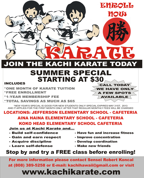 Do not miss our Summer special!!! Great opportunity to join Kachi Karate Hawaii. Classes for kids and adults starting at $30 per month with our special. There is no better way how to start the summer break and save as much as $65. Stop by and try our FREE class before enrolling. For more information please call Sensei Robert (808) 389-5258 or e-mail: This email address is being protected from spambots. You need JavaScript enabled to view it.