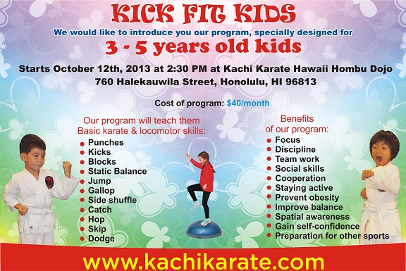 Classes start October 12th, 2013 from 2:30 PM to 3:00 PM and will continue every Saturdays at Kachi Karate Hawaii Hombu Dojo, 760 Halekauwila Street, Honolulu, HI 96813.