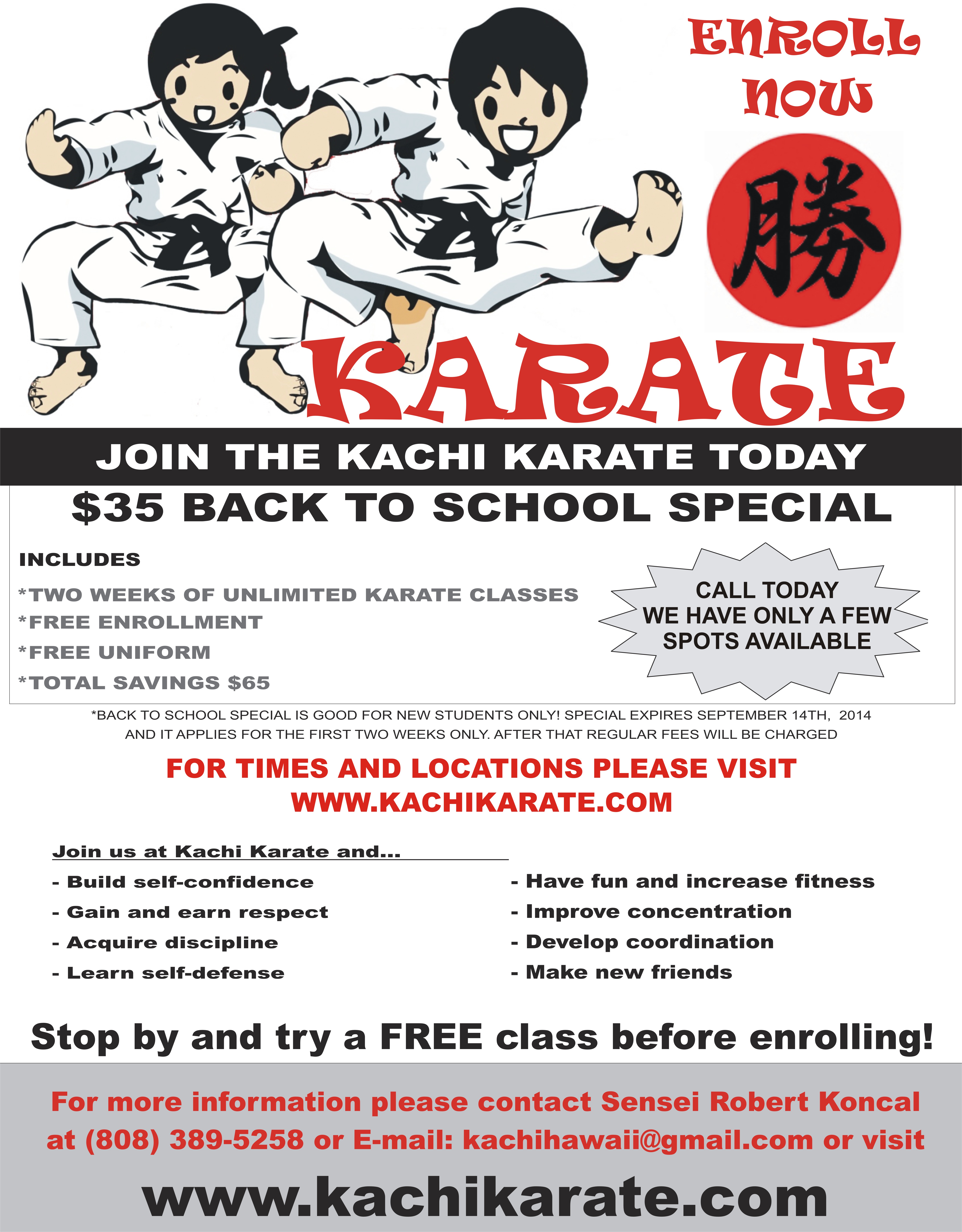 Do not hesitate, this great special won't last long. Register now and pay only $35 for two weeks of UNLIMITED classes, FREE UNIFORM, NO ENROLLMENT FEE. Total savings $65!!! Special is valid unitl September 14th, 2014 and is good for new students only. Choose from these locations: