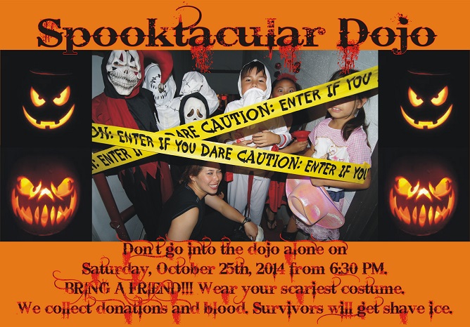 After last year's successful Spooktacular Dojo we are back again this year. Come, enjoy our haunted house with your friends and family and get scared all together. We start at 6:30 PM on Saturday, October 25th, 2014. Don't forget your scary costume. We will be collecting donations. Survivors will get shave ice. Please see the flyer bellow.