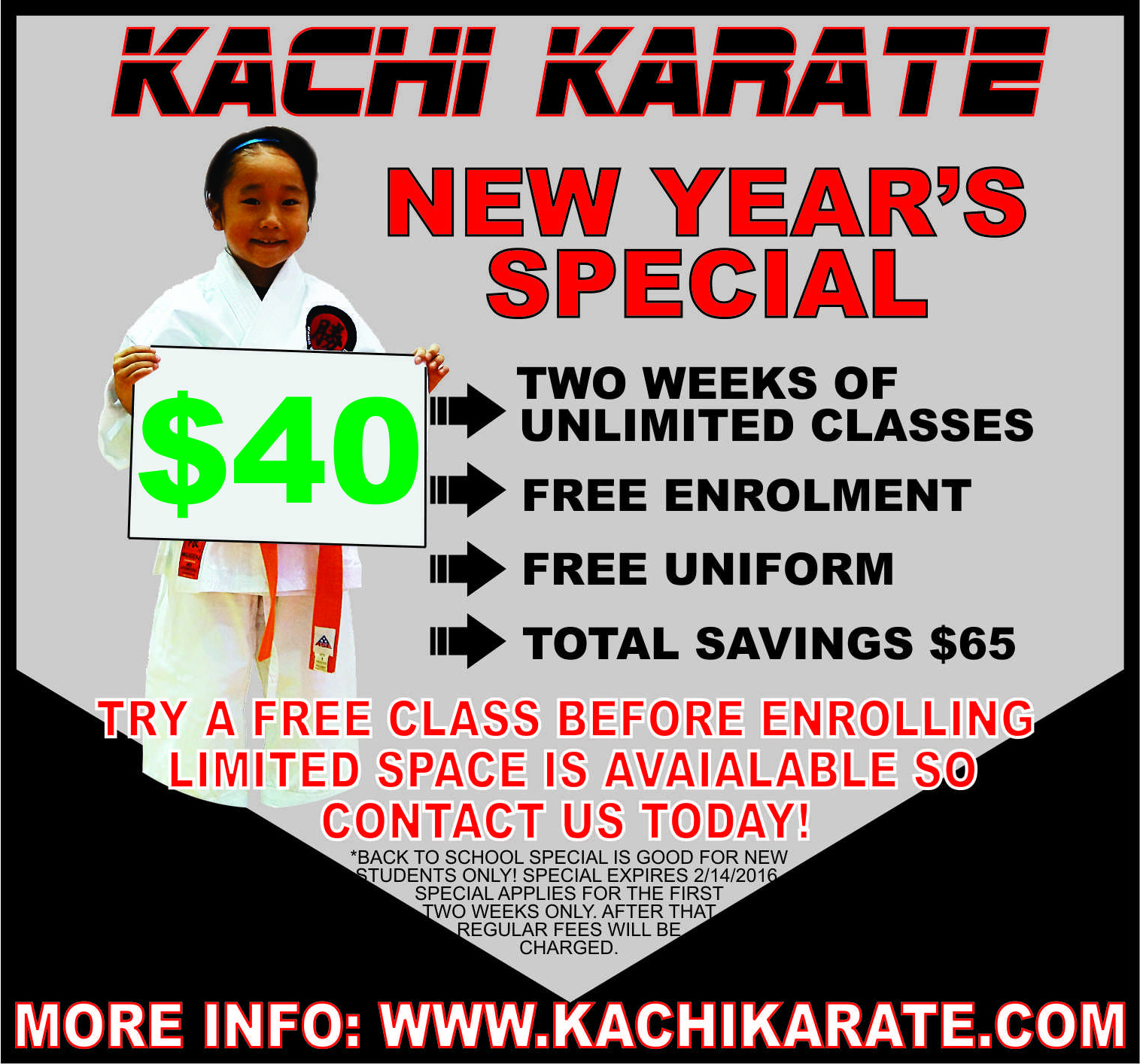Pay only $40 and get a two weeks of UNLIMITED classes, FREE uniform, NO enrollment fee. Save $65!!!