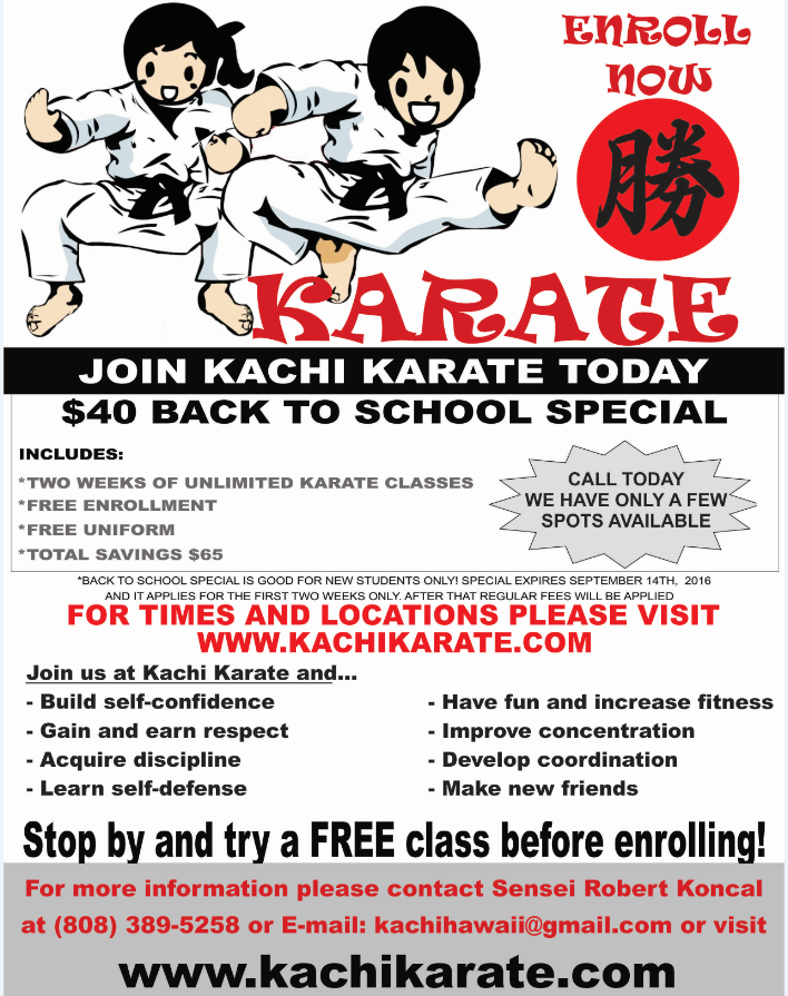 Check out our "BACK TO SCHOOL" special!!! It is a great opportunity for new students to sign up for classes. Pay only $40 for the first two weeks of unlimited classes, get a free uniform and free enrollment fee. Total savings of $65!!! Don't hesitate, this special won't last long. Valid until September 14th, 2016. Limited spots available. Call (808)389-5258 for more information. *Special applies to new students only.*